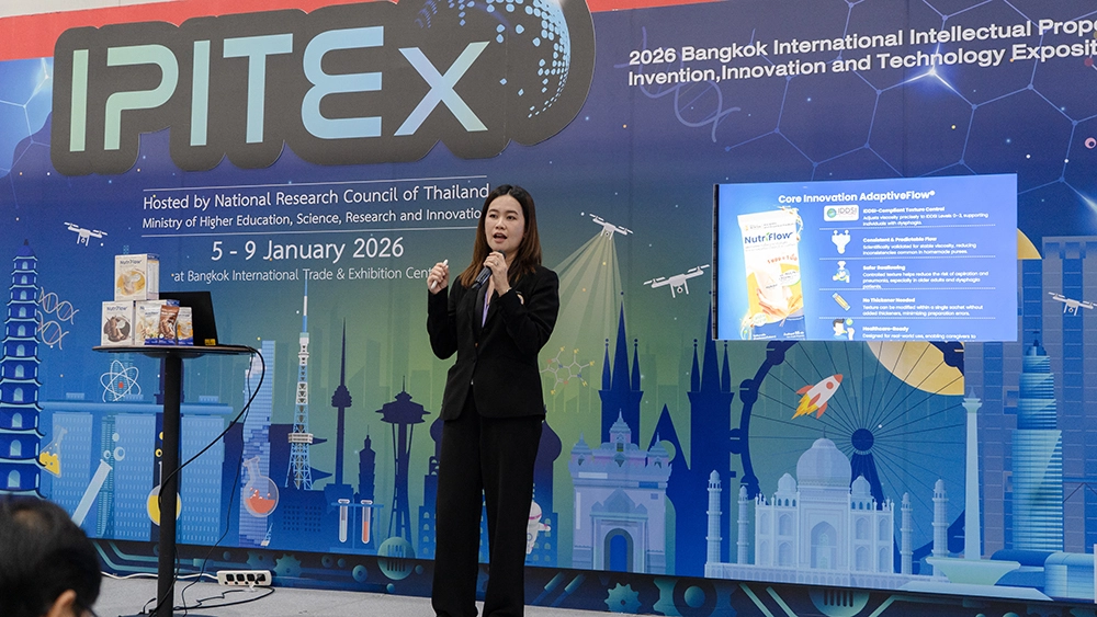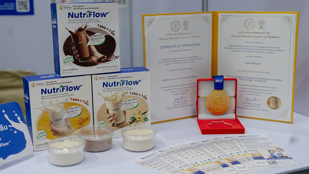 ทีมนักวิจัยจากสถาบันโภชนาการ มหาวิทยาลัยมหิดล นำโดย รศ.ดร.ธัญญ์นลิน วิญญูประสิทธิ์ และคณะฯ ได้ส่งผลงาน “Texture-Modified Complete and Balanced Nutrition Drink Powder (Nutriflow)” หรือนวัตกรรมอาหารสูตรครบถ้วนปรับเนื้อสัมผัส เข้าประกวดบนเวที IPITEx 2026 (Bangkok International Intellectual Property, Invention, Innovation and Technology Exposition) ซึ่งจัดโดยสำนักงานการวิจัยแห่งชาติ (วช.) ณ ศูนย์นิทรรศการและการประชุมไบเทค บางนา